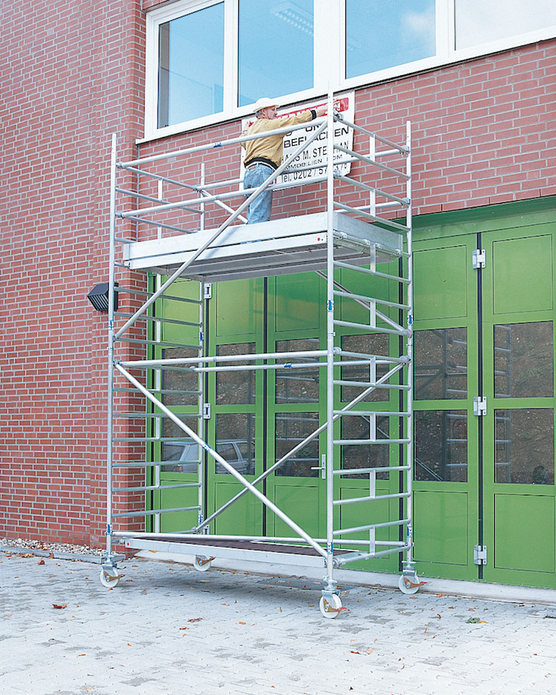 Alle Rollgerüste sind aus Aluminium gefertigt. Ihr Rollgerüst ist daher besonders einfach aufzubauen und flexibel am Einsatzort zu bewegen. Das Rollgerüst verfügt über eine Geländerhöhe von 1,00 m und eine Standhöhe von 2,00 m. Gegen ein Wegrollen oder Verrutschen lässt es sich bequem mittels Hebelbremse sichern. Das gewährleistet ein präzises und zugleich unfallfreies Arbeiten.